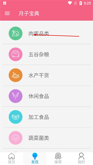 1、打开月子宝典母婴饮食指南APP,在首页找到底部导航栏的发现选项,点击进入分类页面。