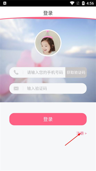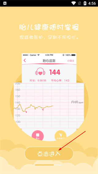 1、打开贝缤纷胎心监测孕期APP,在启动界面找到点击进入按钮,点击进入登录页面。