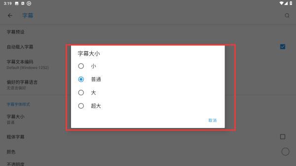 3、在字幕的设置页面,点击字幕大小,在弹出的选项中选择小、普通、大或超大,即可完成字幕大小的调整。
