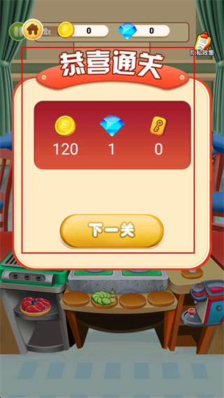 4、在通关结算界面中,点击下一关按钮,进入后续关卡的游戏流程,继续进行烹饪相关的操作任务。