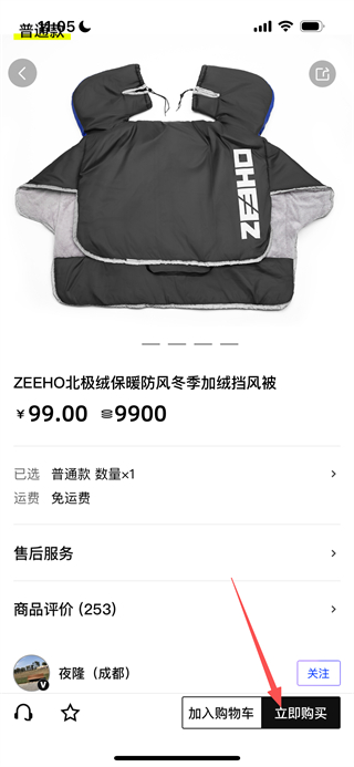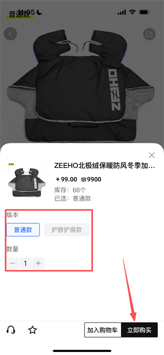 3、在商品详情页面,点击立即购买按钮,会弹出商品规格选择弹窗。