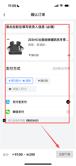5、在确认订单页面,填写收货信息选择支付方式并勾选协议后,点击立即下单按钮即可完成购买。
