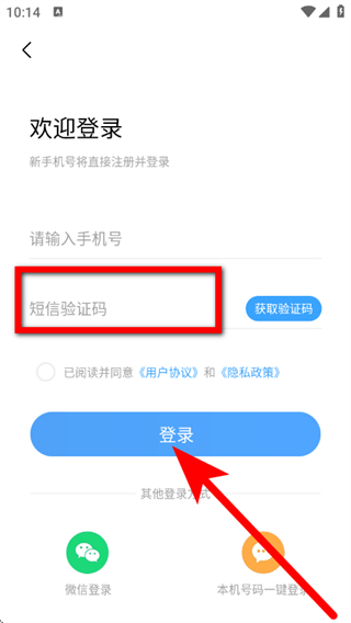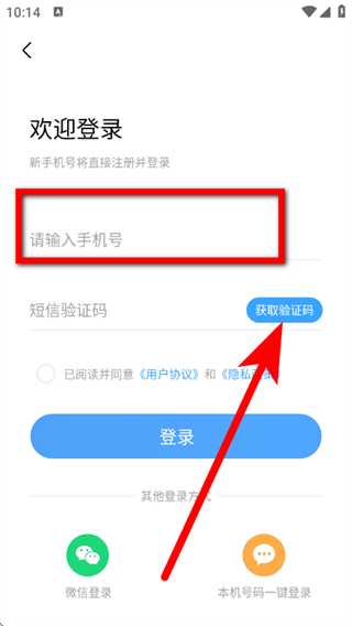 4、在欢迎登录页面,输入手机号,点击获取验证码。
