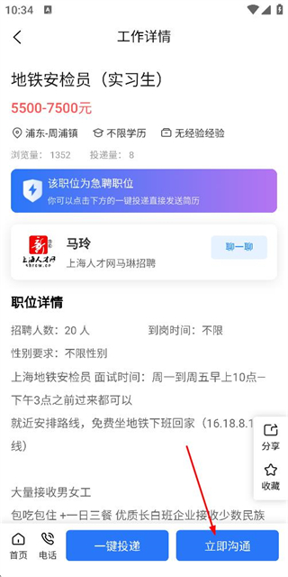 3、在工作详情页面确认信息后,点击一键投递按钮完成该职位的简历投递。