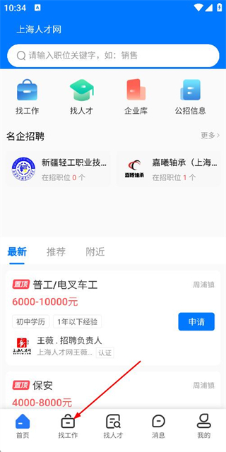 1、在上海人才网首页点击底部找工作选项,进入职位列表页面。