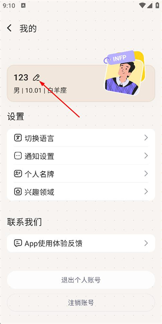 2、在个人中心页面点击昵称旁的编辑按钮,进入个人名牌设置页面。