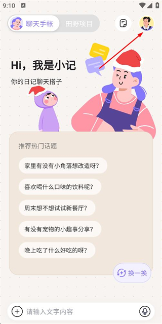 1、在聊天手帐页面点击右上角的头像,进入个人中心页面。