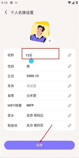 3、在个人名牌设置页面修改信息后,点击保存按钮完成个人信息的更新。