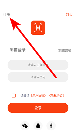 3、在登录页面,点击左上角的注册选项,进入邮箱注册页面。