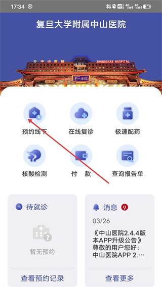 1、打开复旦大学附属中山医院APP,在首页点击预约线下功能,进入预约就诊页面。