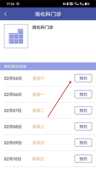 3、进入该门诊的时间选择页面,点击目标就诊日期右侧的预约。