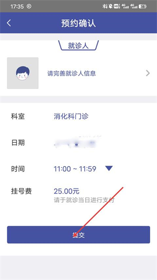 4、在预约确认页面完善就诊人信息,选择就诊时段后点击提交,完成挂号预约。