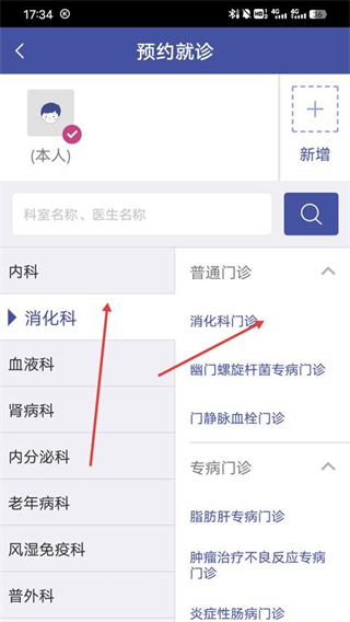 2、在预约页面选择就诊,接着选择科室分类,再选定具体科室及对应门诊。