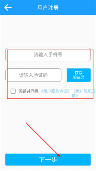 3、填写手机号、获取并输入验证码,勾选协议后点击下一步,按提示完成后续注册步骤即可创建账号。