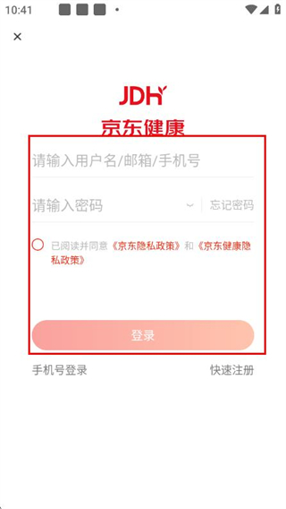 3、在京东健康登录页面,点击快速注册选项,进入注册流程。