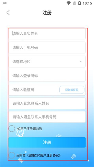 4、填写姓名、手机号、选择地区、设置登录密码,输入验证码,填写紧急联系人信息,勾选协议后点击注册。
