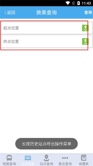 4、在换乘查询界面,依次填写起点位置和终点位置,准备获取对应的公交换乘方案。
