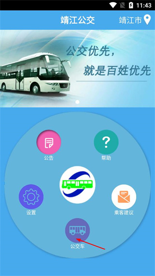 2、进入靖江公交主界面,找到页面中的公交车选项,点击该选项进入公交查询页面。