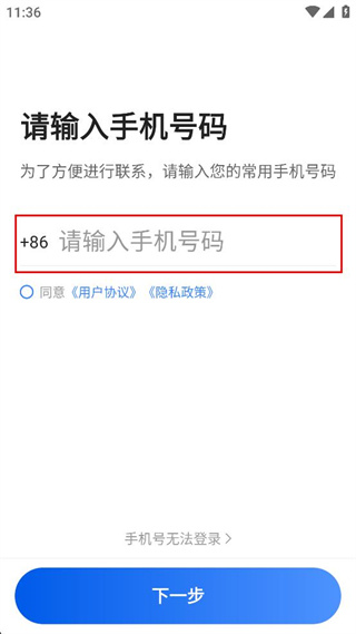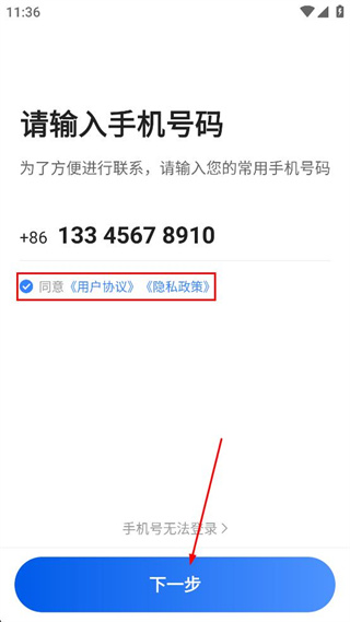 2、进入请输入手机号码页面,在对应输入框填写常用的手机号码,勾选相关协议选项。
