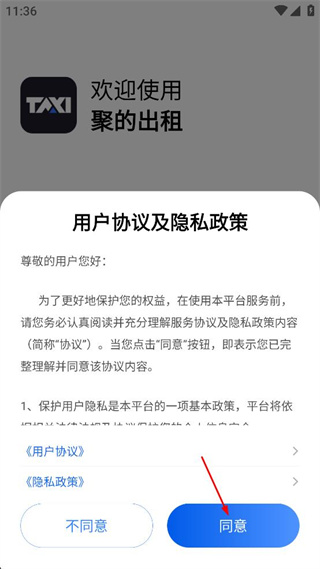 1、打开聚的出租,查看弹出的用户协议及隐私政策内容,点击界面中的同意按钮。