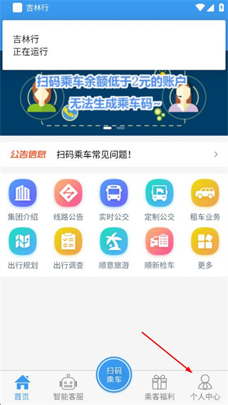 2、进入吉林行主界面,找到页面底部的个人中心选项,点击该选项进入对应的个人中心页面。