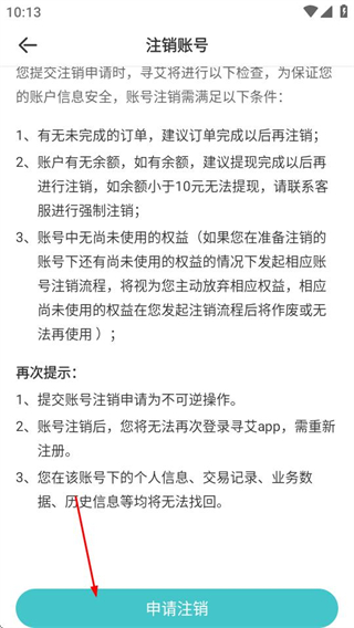 6、在注销账号页面,点击申请注销按钮,可进入手机验证页面。