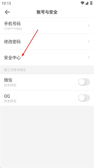 4、在账号与安全页面,点击安全中心选项,可进入安全中心页面。