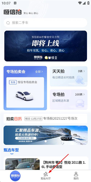 1、在恒信拍首页点击底部竞拍大厅选项,进入竞拍车辆列表页面。