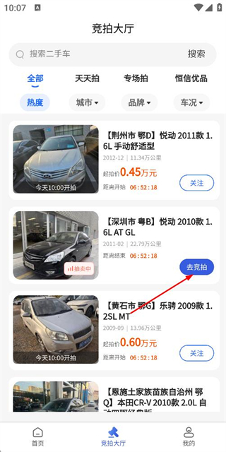 2、在竞拍大厅页面点击目标车辆旁的去竞拍按钮,进入该车辆的详情页面。