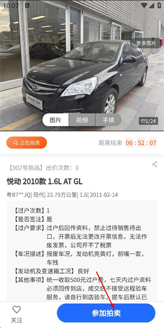 3、在车辆详情页面确认信息后,点击参加拍卖按钮参与该车辆的竞拍流程。