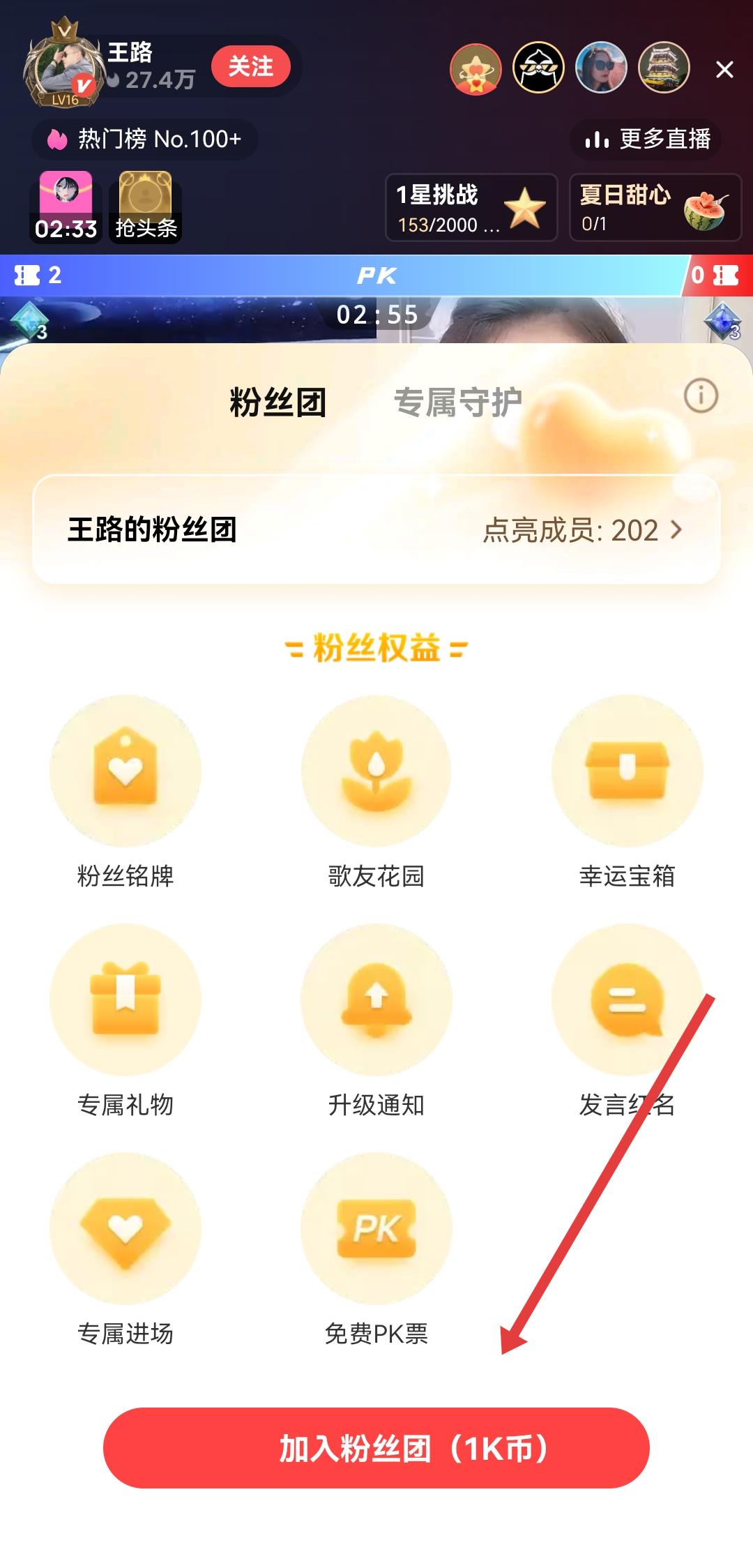3、在粉丝团详情页点击加入粉丝团1K币按钮,完成支付后即可加入,享受粉丝铭牌、歌友花园等专属权益。