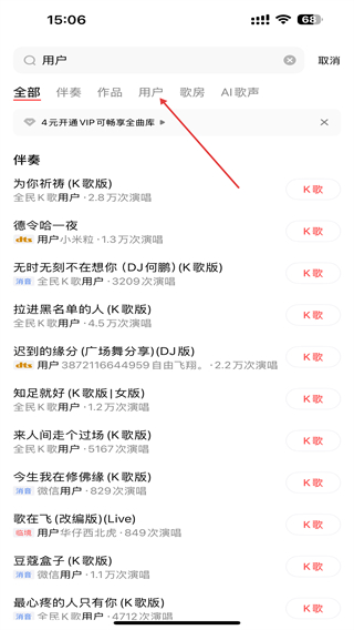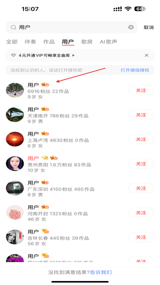 3、搜索后,将标签切换至用户的页面,点击即可。