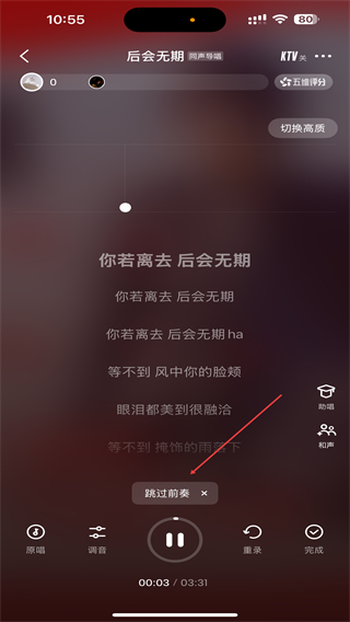 3、进入录歌的页面内,可点击跳过前奏开始唱歌。