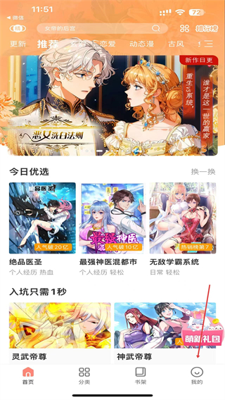 1、打开飒漫画App,进入时点击底部我的按钮。