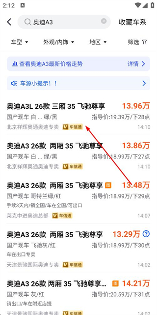 3、进入车源列表页面后,即可查看奥迪A3的具体车源信息及价格详情。