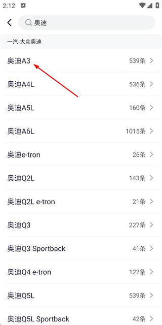 2、在车型列表页面点击奥迪A3选项,进入奥迪A3的车源列表页面。
