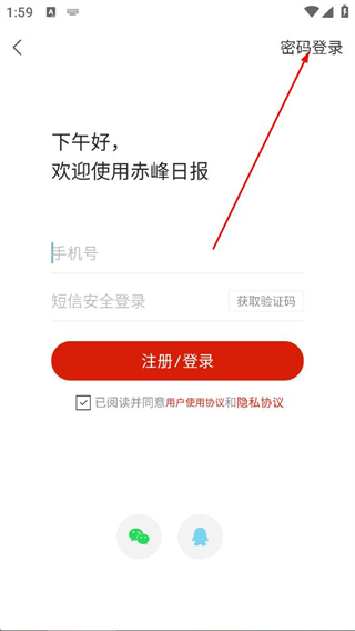 3、在登录界面,点击右上角的密码登录选项,切换至密码登录界面。