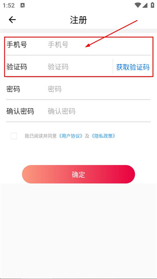 4、在注册页面,填写手机号并点击获取验证码后,填写验证码。