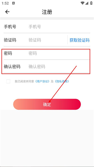 5、在注册页面,填写密码和确认密码,点击确定按钮,完成注册。