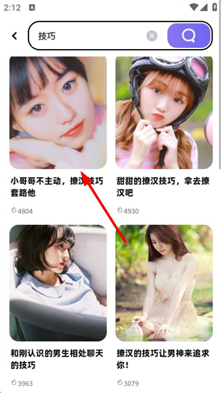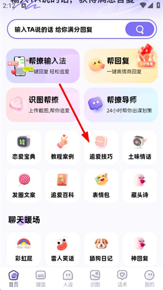 1、进入帮撩输入法后,点击追爱技巧选项,可进入追爱技巧的文章列表页面。