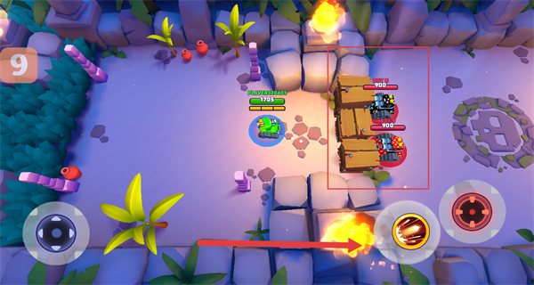 4、当敌方单位聚集或有障碍物阻挡时,点击黄色大招按钮,释放范围技能,将障碍物与敌方单位一并清除。