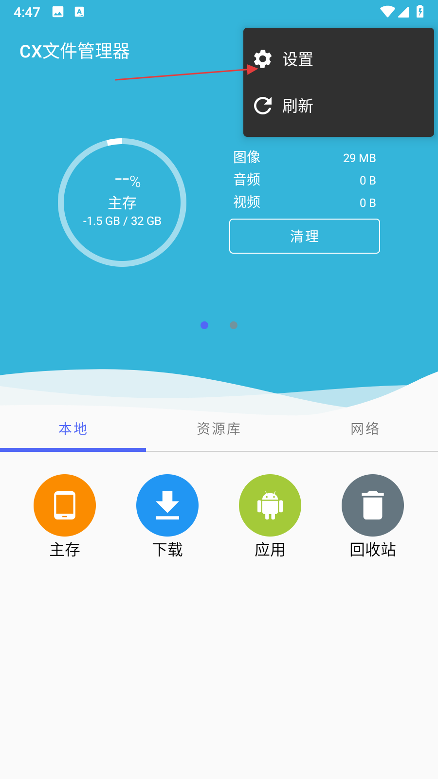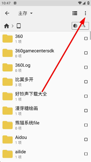 1、打开CX文件管理器,点击界面右上角的三点菜单图标,展开功能选项。