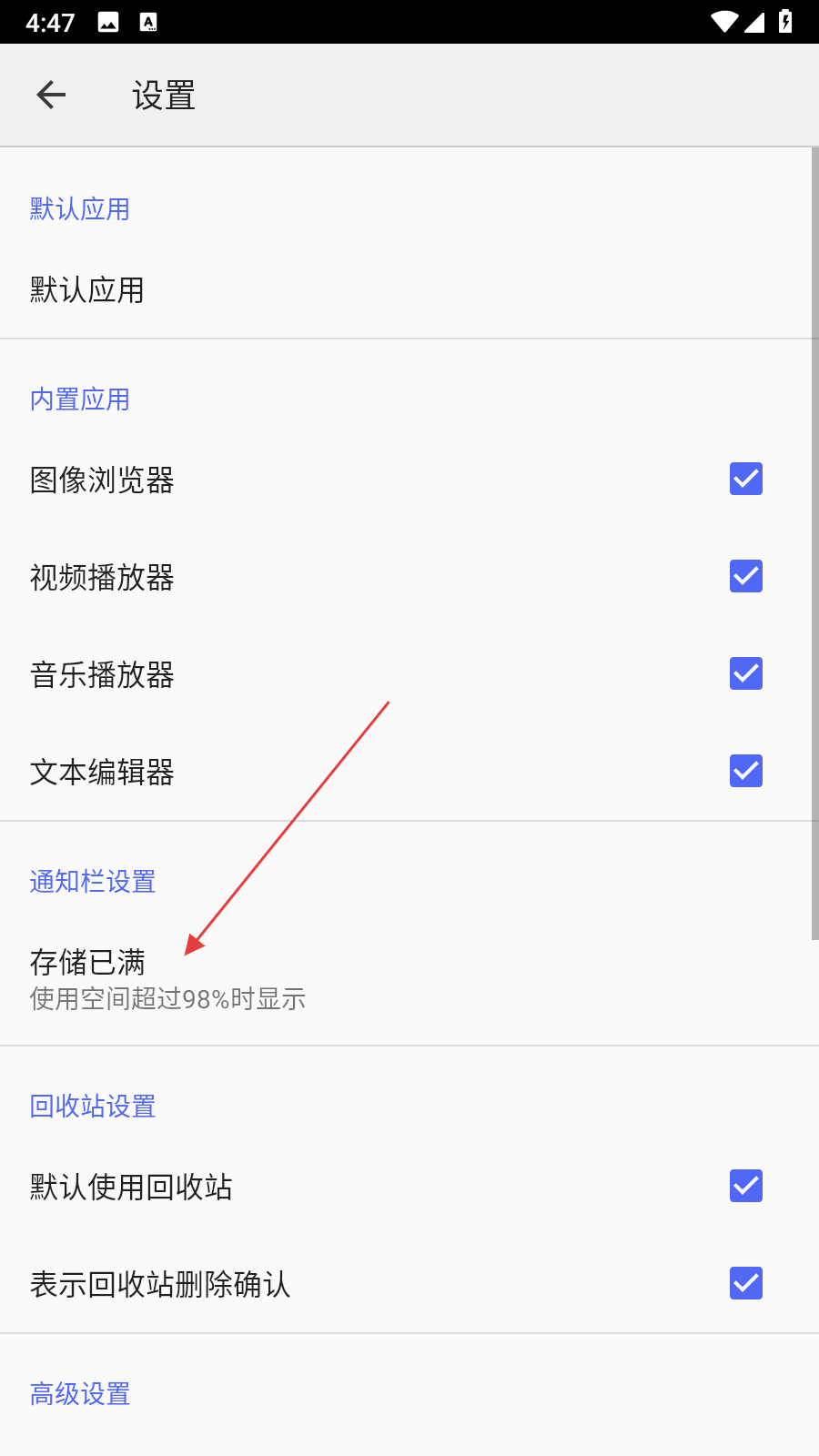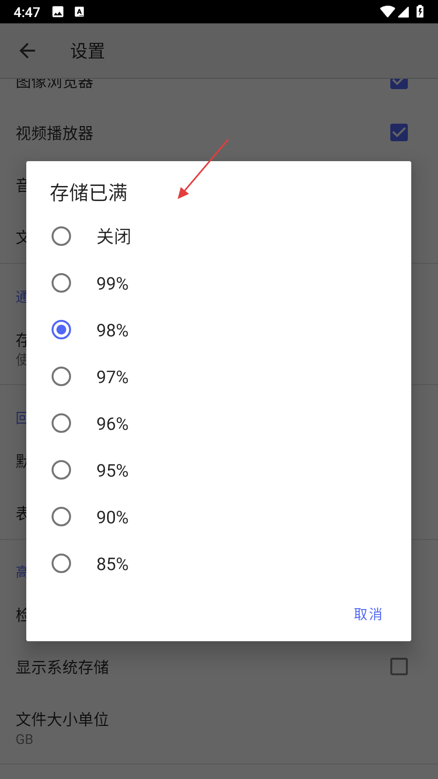 3、在设置页面里,找到存储已满选项,点击该选项,弹出存储已满的触发阈值选择框。