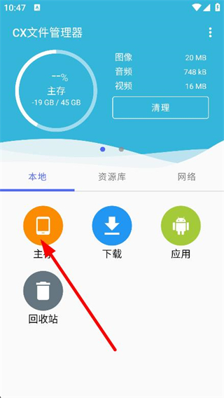 1、打开CX文件管理器,在本地页面点击主存选项。