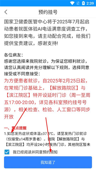 2、在预约挂号的须知页面,勾选我已经阅读并同意预约须知后点击我知道了。