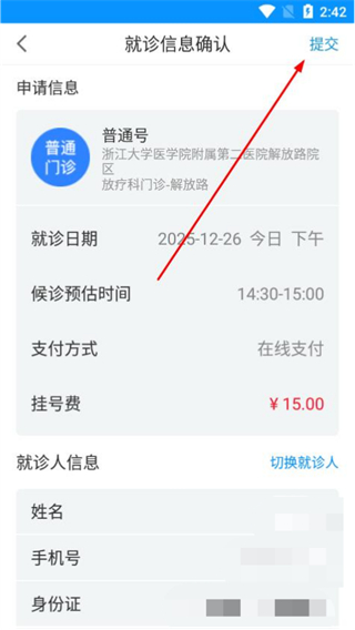 7、在就诊信息确认页面,核对信息后点击提交,完成挂号预约。