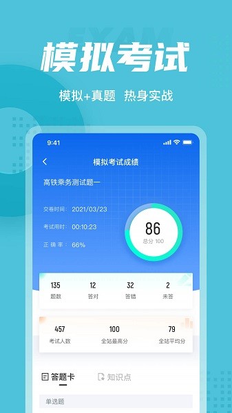 乘务员题库内含考点练习,全国通用卷以及地区卷模拟练习,以及按照固定考试比重的随机式的抽题的真题考场,成绩单实时记录考试数据,一点一滴的反馈考生近期学习状态以及自我正确率的提升,大大的给予考生通过考试的信心。