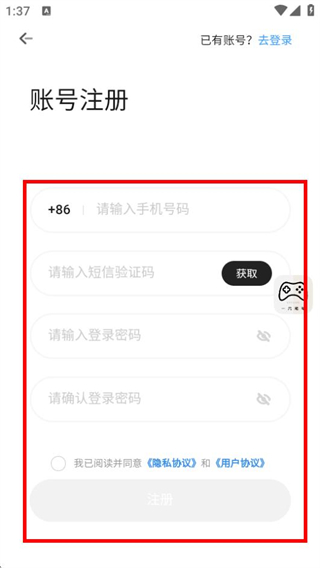 3、在注册页面,依次填写信息并勾选协议后,点击注册按钮即可完成账号注册。