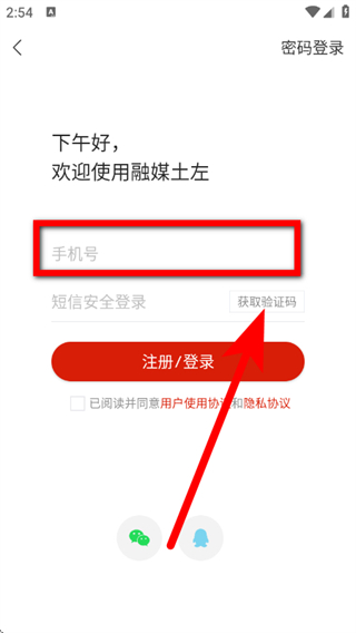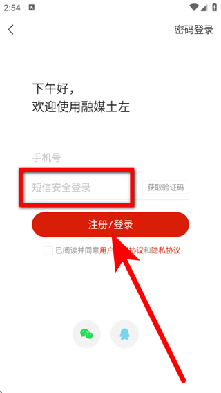 3、在密码登录页面,输入手机号,点击短信安全登录,点击获取验证码。