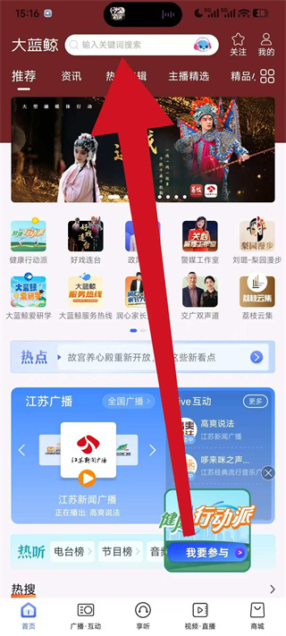 1、打开大蓝鲸,进入首页后,点击顶部的搜索框。